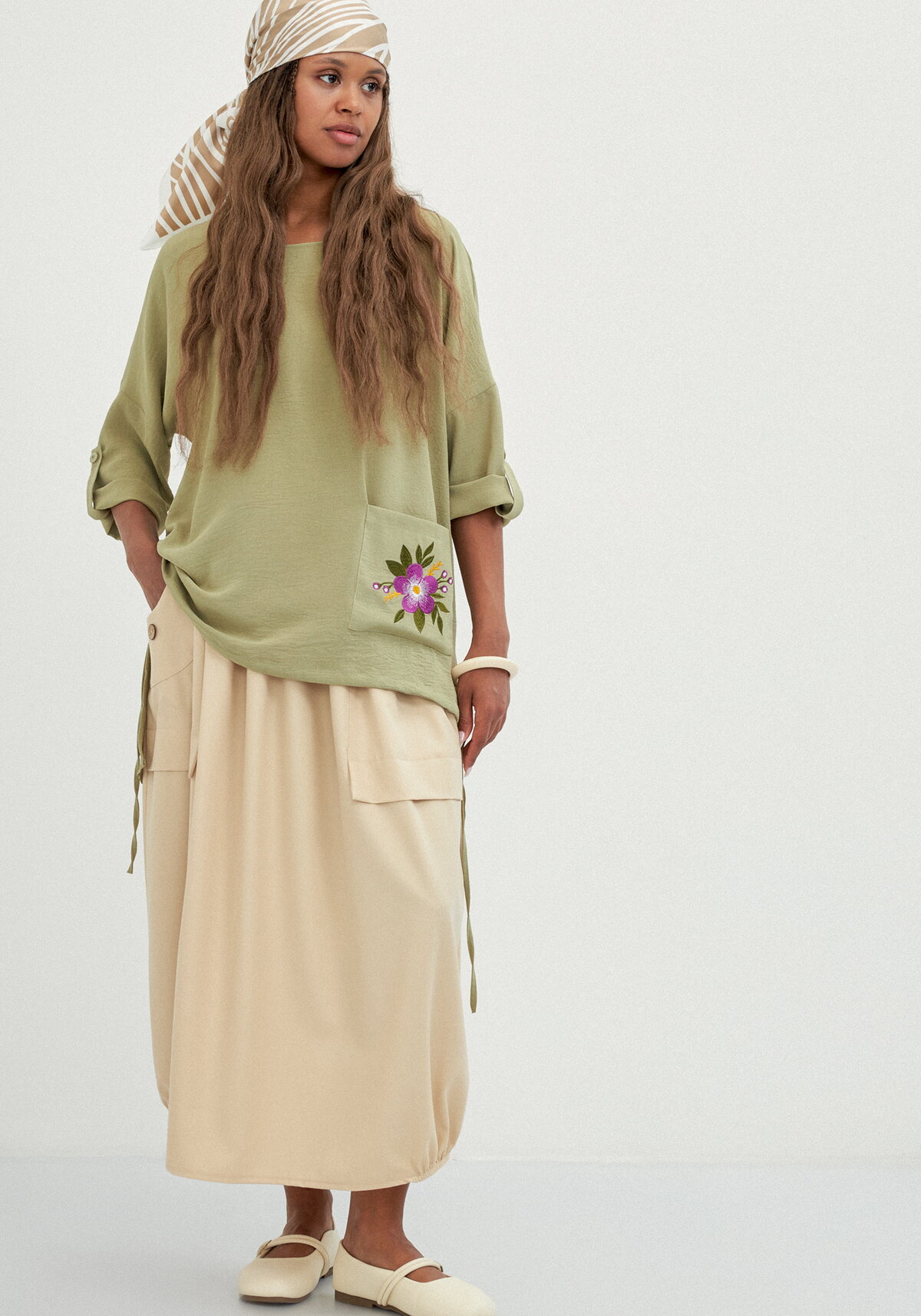 Юбка в стиле бохо свободного кроя. Пояс на резинке с кулиской. Впереди накладные карманы, декорированные пуговицами. По бокам по низу юбки проходит резинка для создания О-силуэта. Модель представлена в двух цветах: молочный и синий.