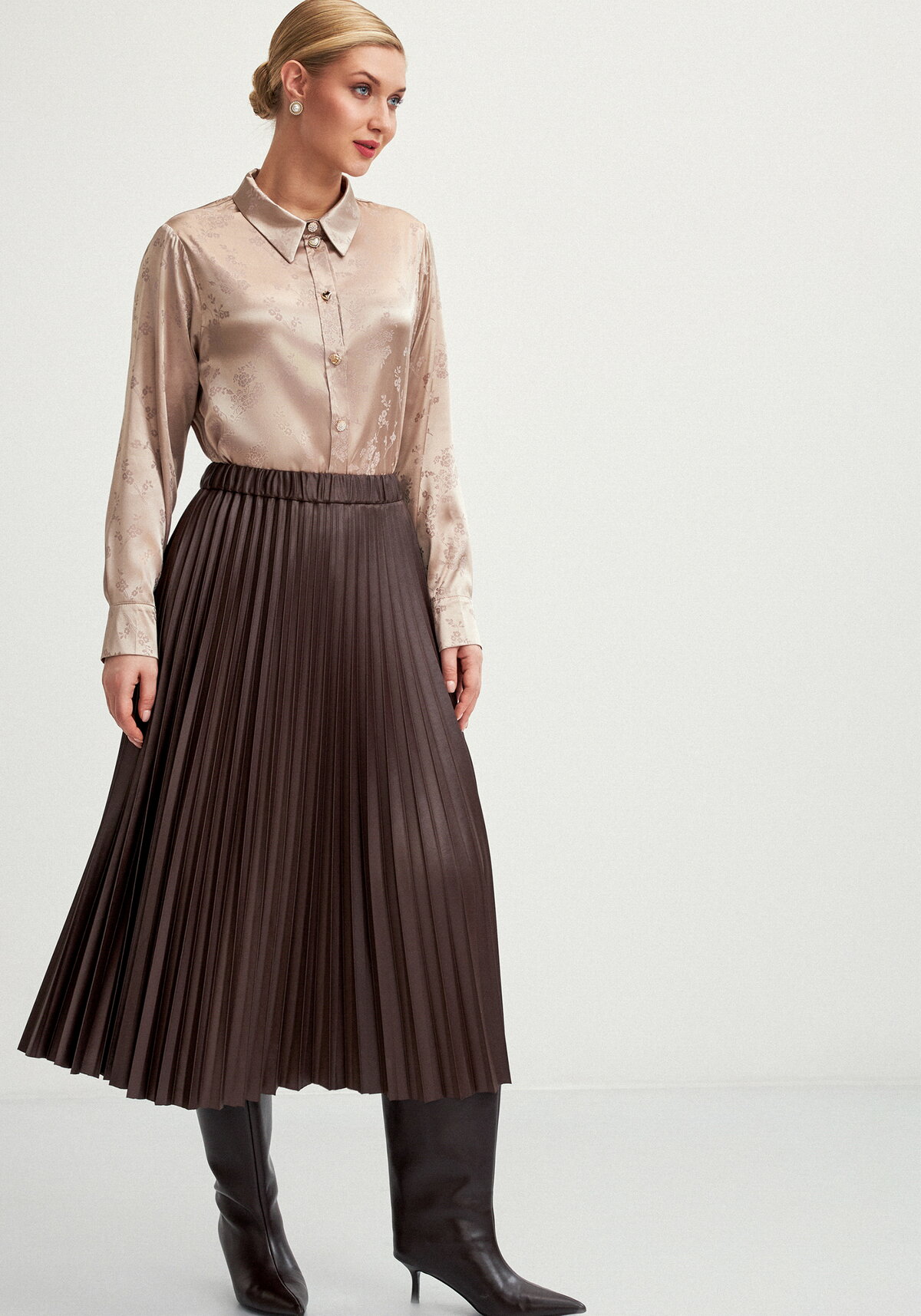 Плиссированная юбка длины миди. Эластичный пояс обеспечивает комфортную посадку.