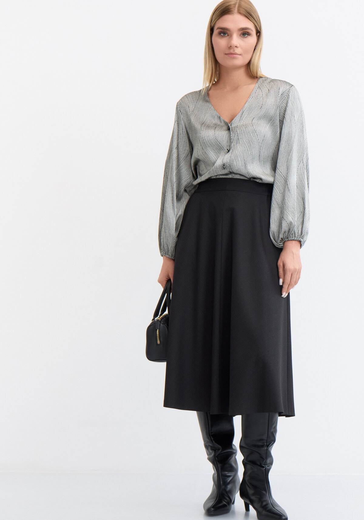 Юбка А-силуэта в длине ниже колена. Притачной пояс, по бокам вставлена эластичная тесьма. Застегивается на потайную молнию и пуговицу. Модель выполнена из костюмной поливискозы. Дополните юбку базовым лонгсливом или джемпером.