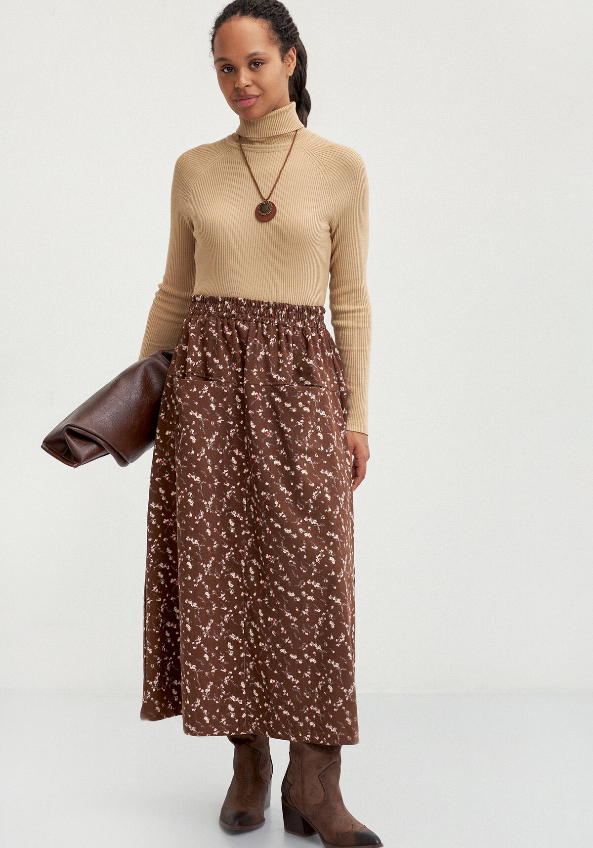 Изящная юбка А‑силуэта выполнена по четырехклинной конструкции, что обеспечивает гармоничные пропорции и комфортную посадку. Модель украшена кокеткой как спереди, так и на спинке, придающей изделию изысканный вид. Удобный пояс на резинке гарантирует комфорт при носке, а функциональные карманы под передней кокеткой делают юбку практичной в повседневном использовании.