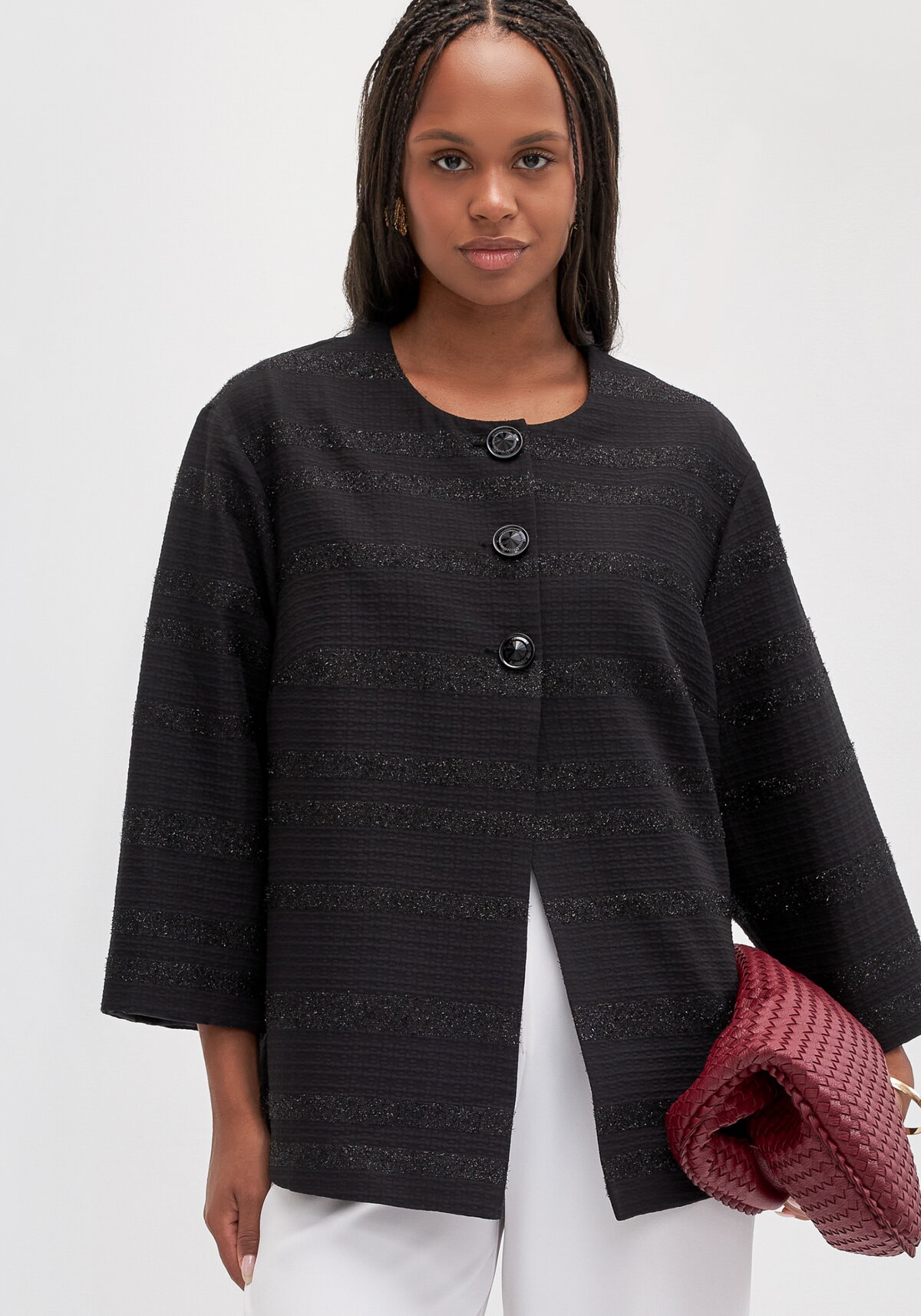 Жакет в полоску с металлизированной нитью. На подкладке, рукав 3/4, длина до бедер, застежка на пуговицы. Для повседневного и праздничного гардероба.