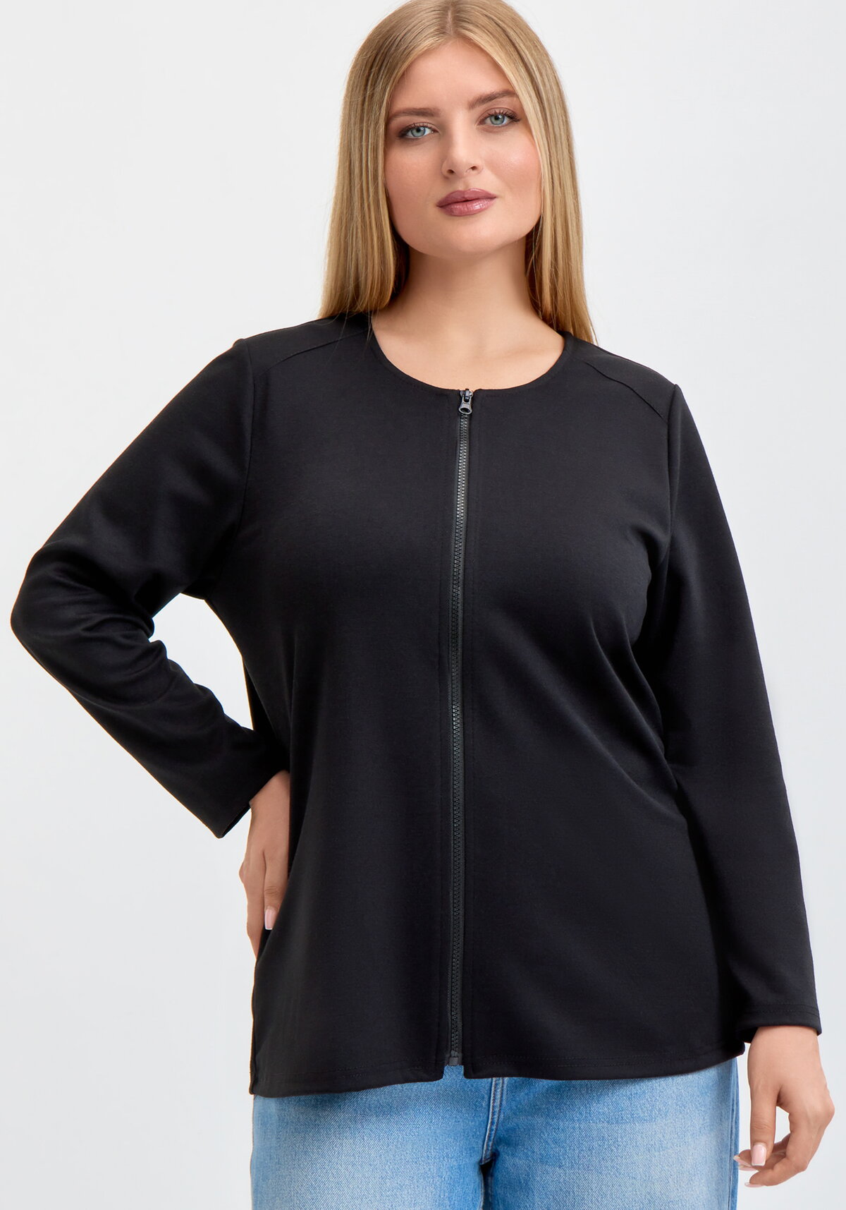 Жакет полуприлегающего силуэта. Полочка с застежкой на молнию до конца. Горловина круглая, обработана обтачками и закреплена отделочной строчкой по полочке и спинке. Рукава втачные одношовные. По шву притачивания молнии прострочена отделочная строчка. Низ рукавов и низ изделия подшиваются на плоскошовной машине.