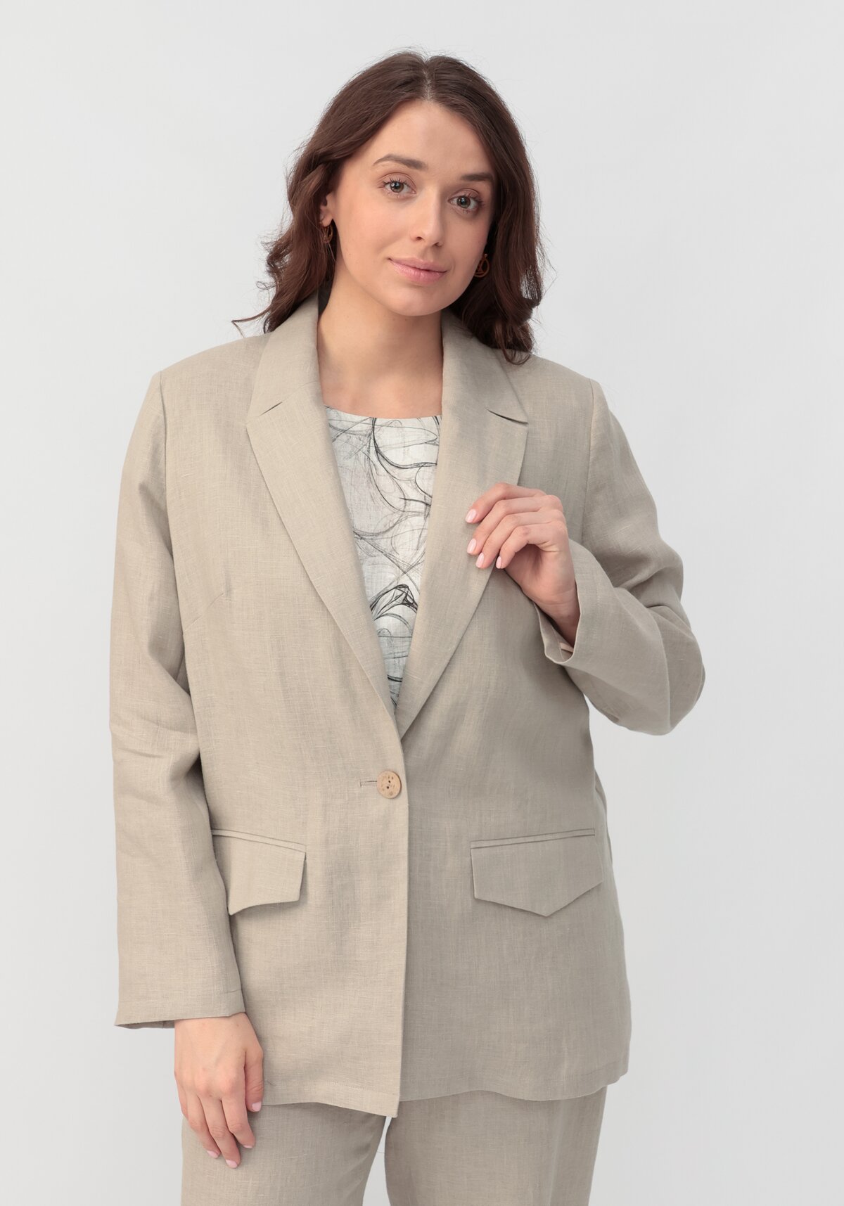 Пиджак прямого кроя с двумя карманами с клапанами. Застегивается на одну петлю и пуговицу в области талии. Пиджак без подклада с наплечниками. Составляет костюм с брюками идентичной ткани и цвета.