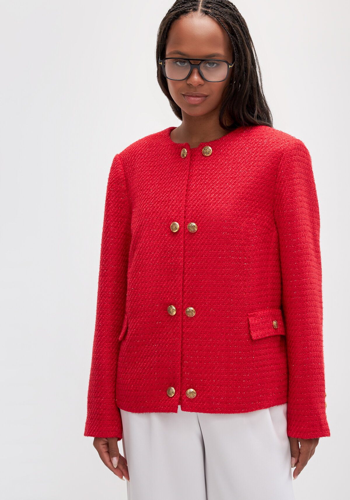 Жакет прямого силуэта с круглой горловиной из мягкой твидовой ткани. На подкладе в цвет основной ткани. Имитация двубортной застежки с металлическими пуговицами. Прорезные карманы с клапаном. Модель подходит на все типы фигур.