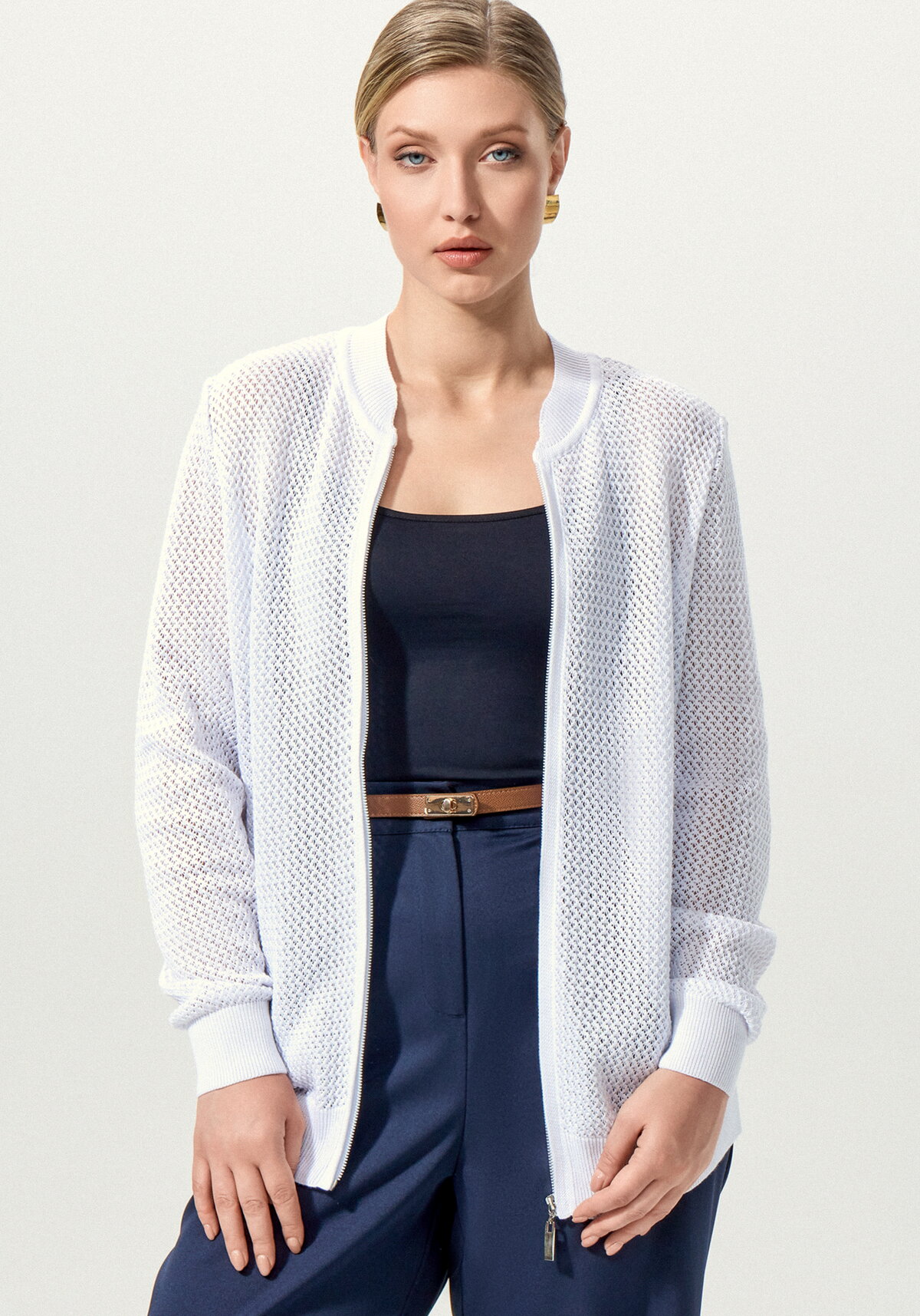 Изящный хлопковый кардиган на молнии. Манжеты и низ изделия — широкая резинка. Прямой силуэт с припуском на свободу движения корректирует фигуру в области талии. Оригинальный воротник стилизован под бомбер. Модель представлена в трех цветах: сиреневый, белый, черный.