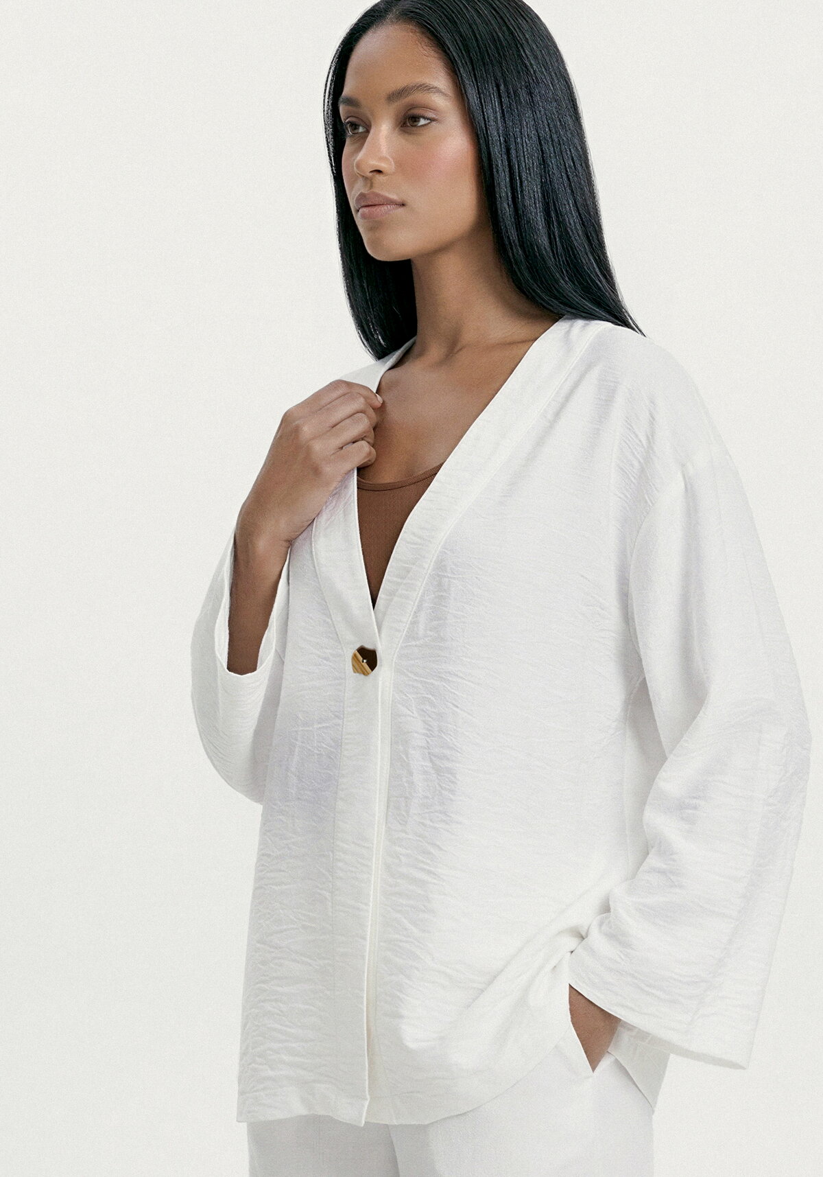 Откройте для себя очарование современного стиля с жакетом свободного кроя — вашей новой любимой вещью в гардеробе! V‑образный вырез изящно подчёркивает линию шеи, а лаконичная застёжка на пуговицу придаёт модели сдержанную элегантность. Боковые разрезы добавляют силуэту лёгкости и динамики, делая образ по‑настоящему актуальным. Свободный крой не сковывает движений и идеально подходит для создания как деловых, так и повседневных луков. Сочетайте этот жакет с юбками, брюками или платьями — и каждый раз получайте безупречный результат, полный шарма и утончённости!