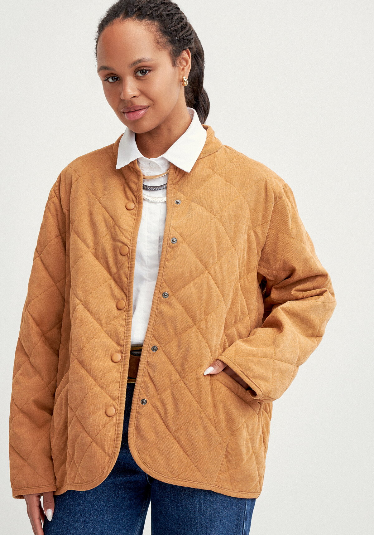 Стильный стеганый жакет оверсайз станет удачным выбором для прохладной погоды. Модель сочетает приятную на ощупь ткань — микровельвет — с теплой фланелевой подкладкой и синтепоновым утеплителем, гарантирующим комфорт при температуре от 0 до +10 °C. Лаконичная однобортная застежка на кнопки и строгий воротник‑стойка создают элегантный образ, а вельветовая окантовка по краю борта, стойке и низу жакета придает изделию изысканный акцент. Свободный рукав и прорезные карманы «листочка» обеспечивают удобство, а мягкие вытачки на полочке и спинке деликатно формируют силуэт.