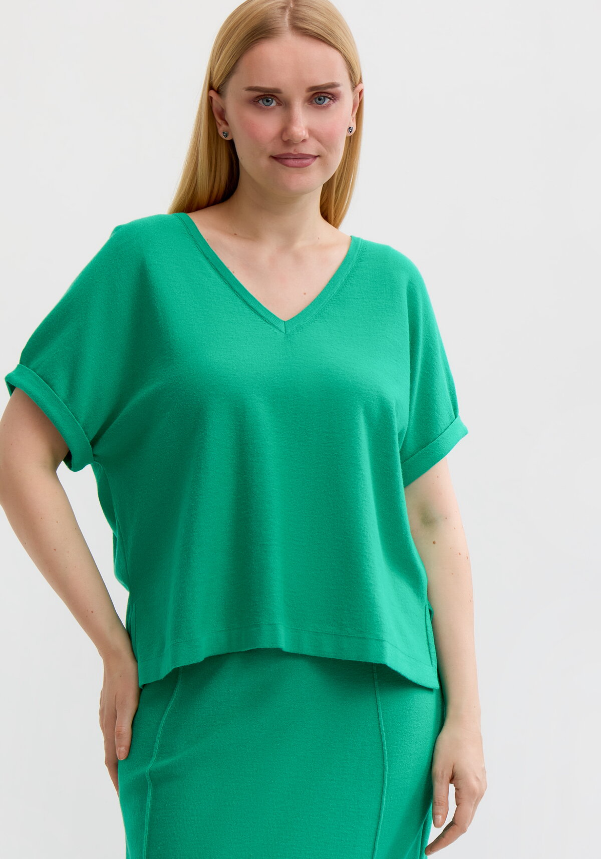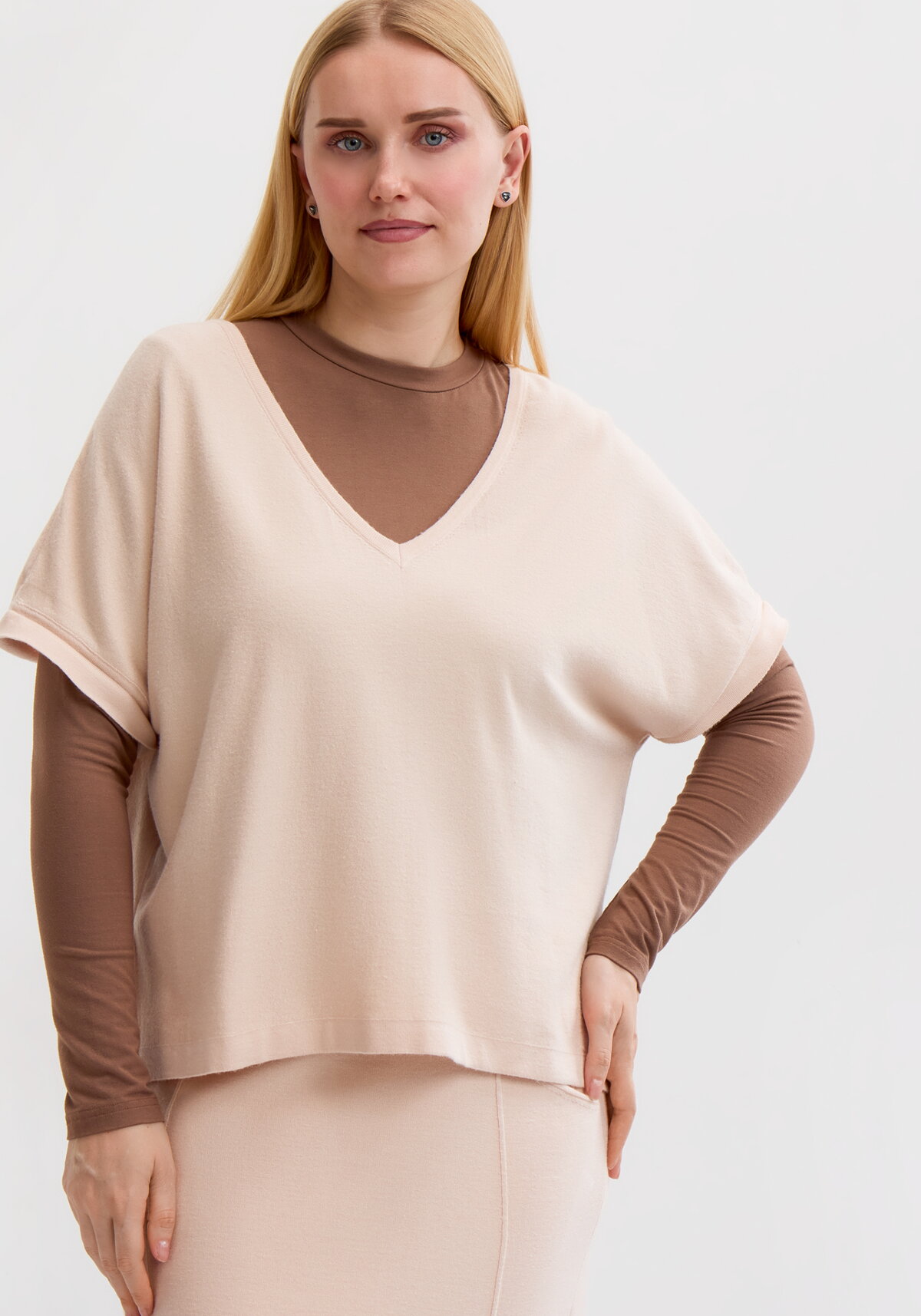 Жилет свободного кроя с удлиненной спинкой и разрезами по бокам. Глубокий V-образный вырез и аккуратные манжеты по краю рукава создают лаконичный, современный силуэт. Универсальная модель, которую можно носить как самостоятельный джемпер в теплое время года или сочетать с рубашкой, блузкой или водолазкой.