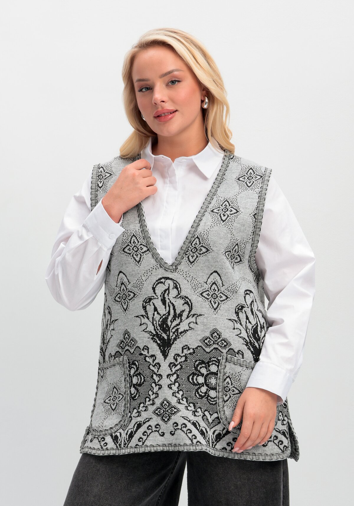 Удлиненный жилет из овечьей шерсти с контрастным узором и двумя накладными карманами. Стильный и теплый предмет гардероба. Широкий ассортимент расцветок позволит подобрать вариант под ваш цветотип и предпочтения. Универсальный прямой крой подойдет женщине с любым типом фигуры.