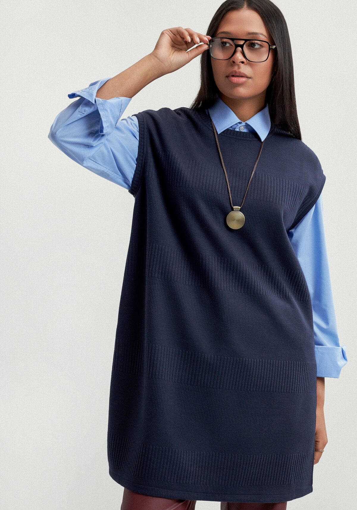 Жилет из трикотажного полотна А-силуэта. Длина чуть выше колена. Круглый вырез горловины. Горловина и проймы с внутренней окантовкой. Высокие разрезы по боковым швам.