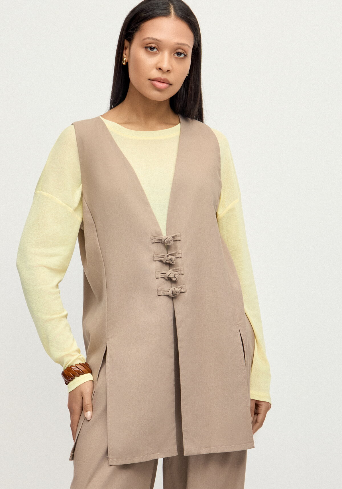 Почувствуйте безупречный стиль и комфорт с удлинённым жилетом из натуральной ткани с добавлением льна — настоящей находкой для современного гардероба! Лаконичный крой подчёркивает силуэт, не сковывая движений, а боковые разрезы добавляют модели динамичности и обеспечивают абсолютную свободу действий. Льняная нить в составе дарит приятную лёгкость и позволяет коже «дышать» в течение всего дня. Этот жилет легко впишется в самые разные образы — от деловых до повседневных — и станет универсальным акцентом вашего стиля.