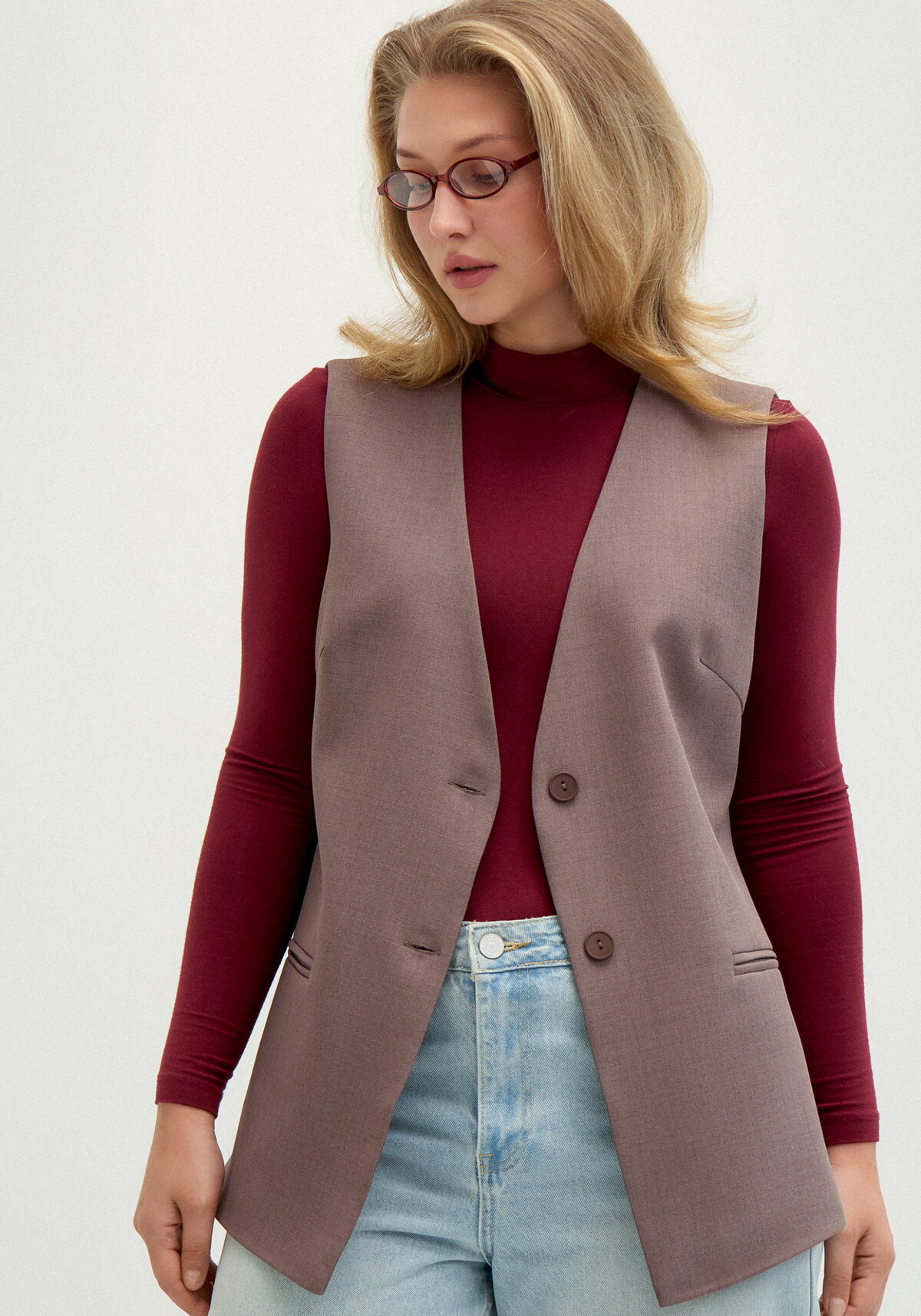 Жилет приталенного силуэта на подкладке. Застёжка однобортная, V-образный вырез горловины. Функциональные прорезные карманы. Модель представлена в трех цветах: коричневый, синий, зеленый.