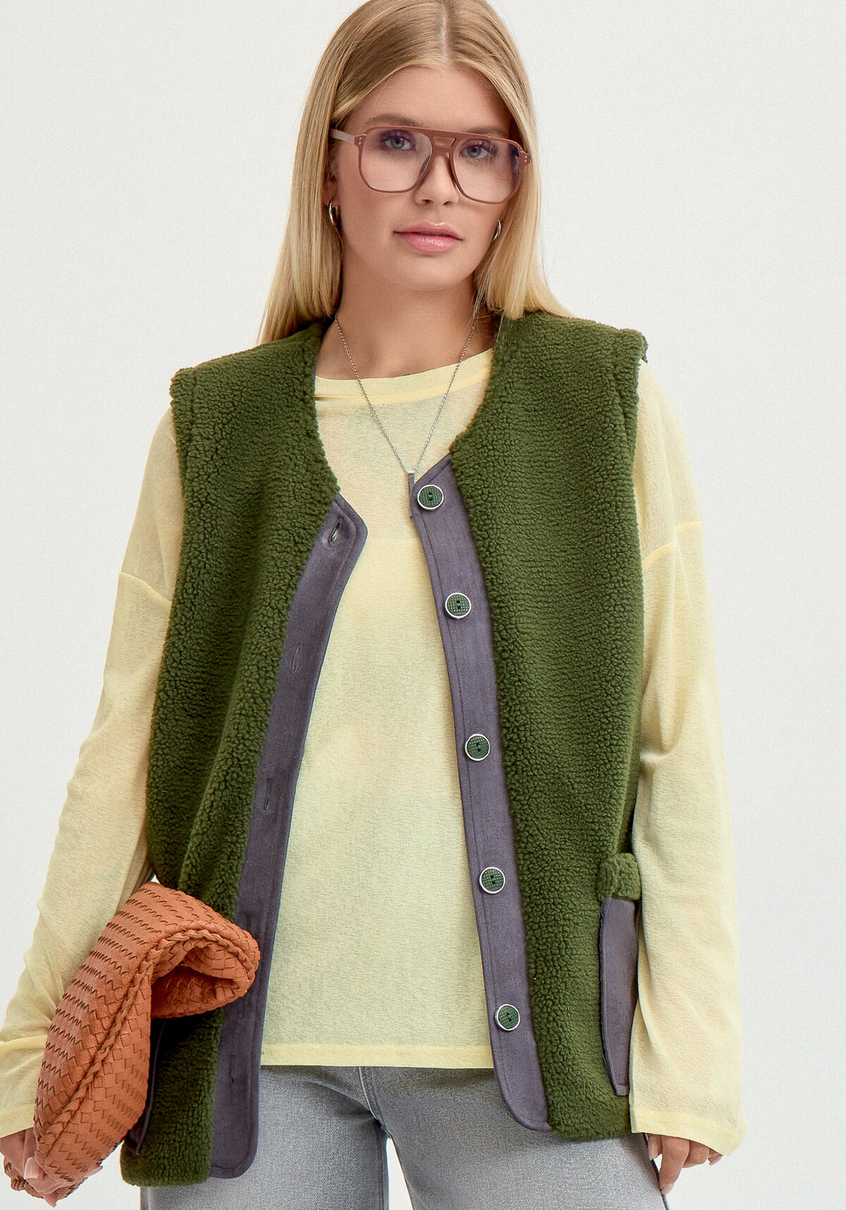 Жилет на подкладе со вставками из замши. Свободный силуэт с накладными карманами. Застегивается на пуговицы.