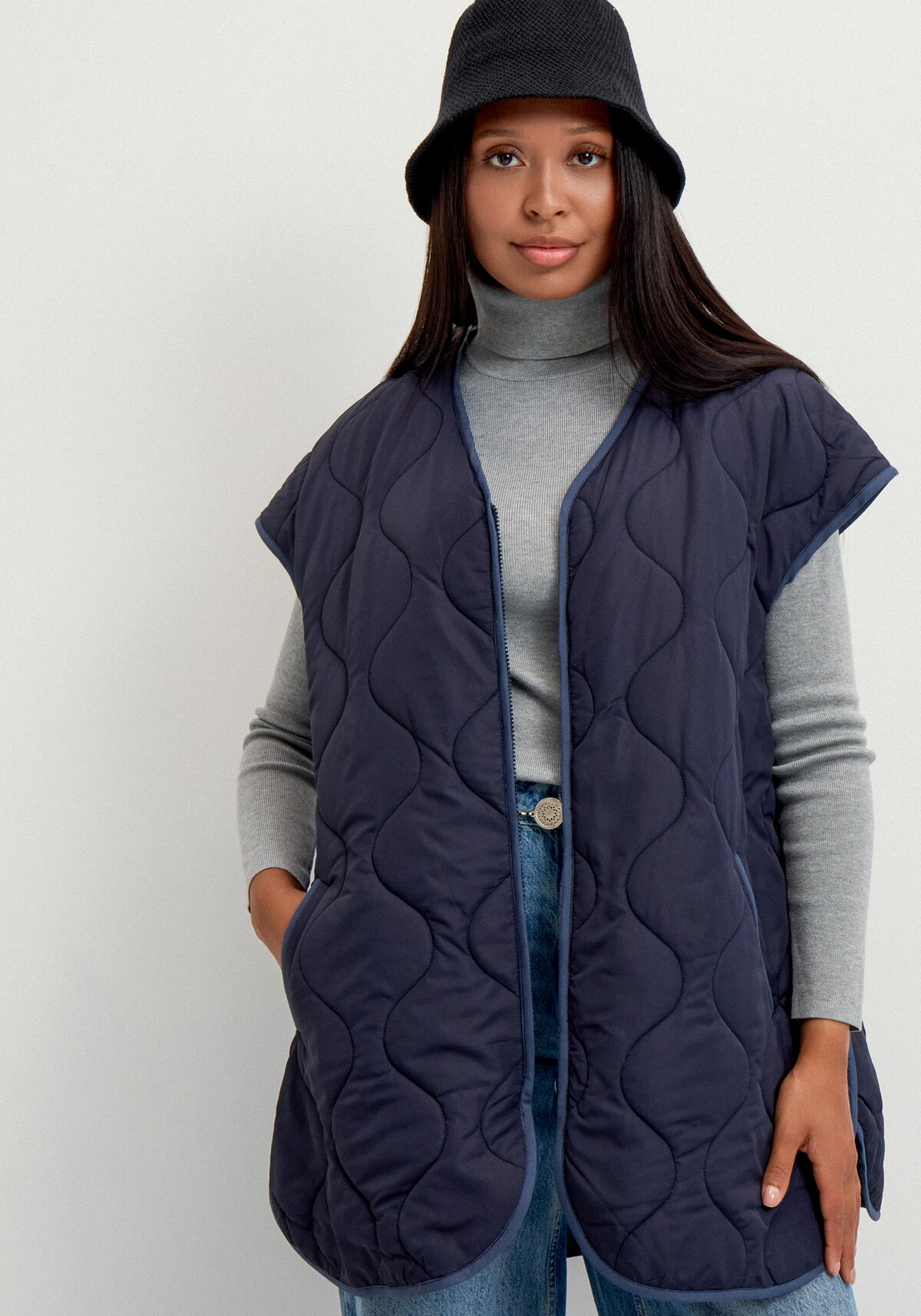 Жилет из стеганного синтепона на подкладе. Карман с листочкой. Застежка на молнии, по бокам застежка на кнопках. Модель представлена в двух цветах: бежевый и синий.